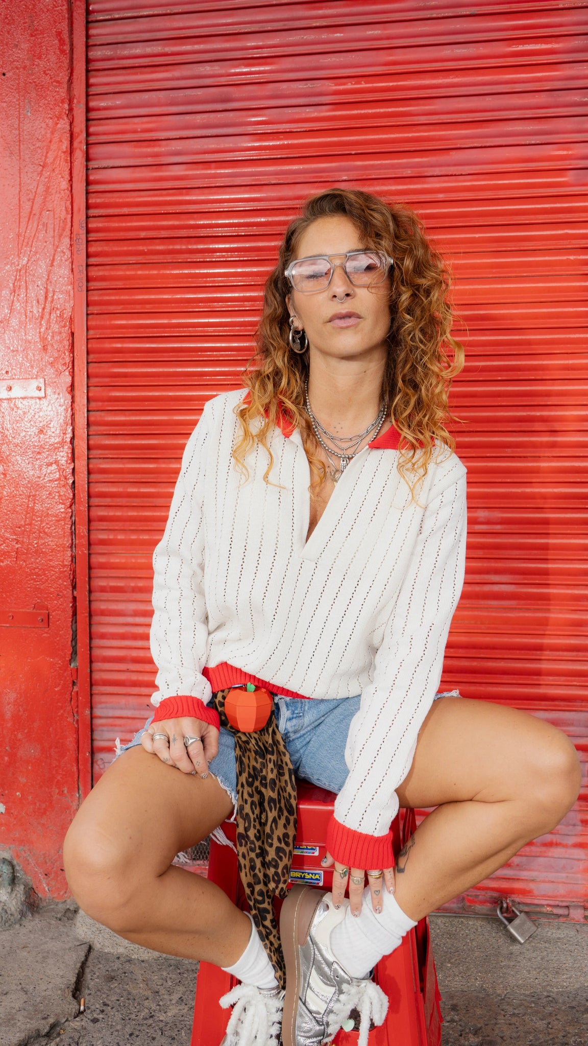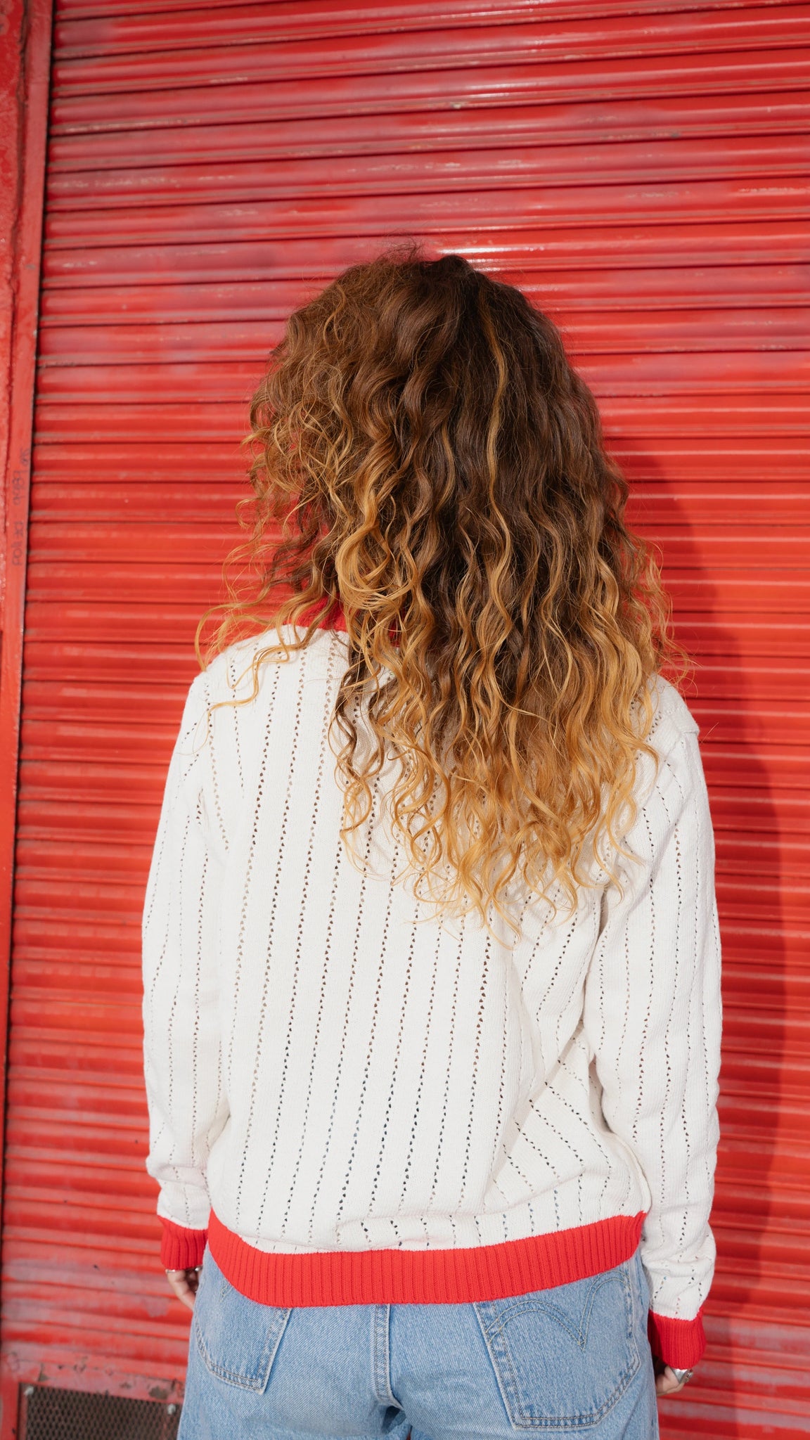 Saco tipo polo en beige con cuello y resortes rojos que rompen la neutralidad y atraen la mirada. Su tejido calado forma líneas en la superficie, creando un juego visual que suma textura y movimiento. Una pieza clave para construir looks con intención, donde lo clásico se mezcla con detalles que no pasan desapercibidos.
